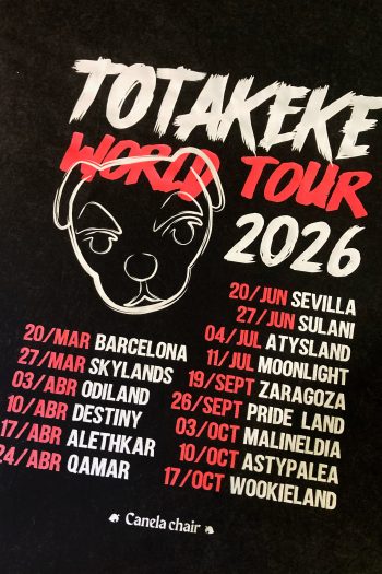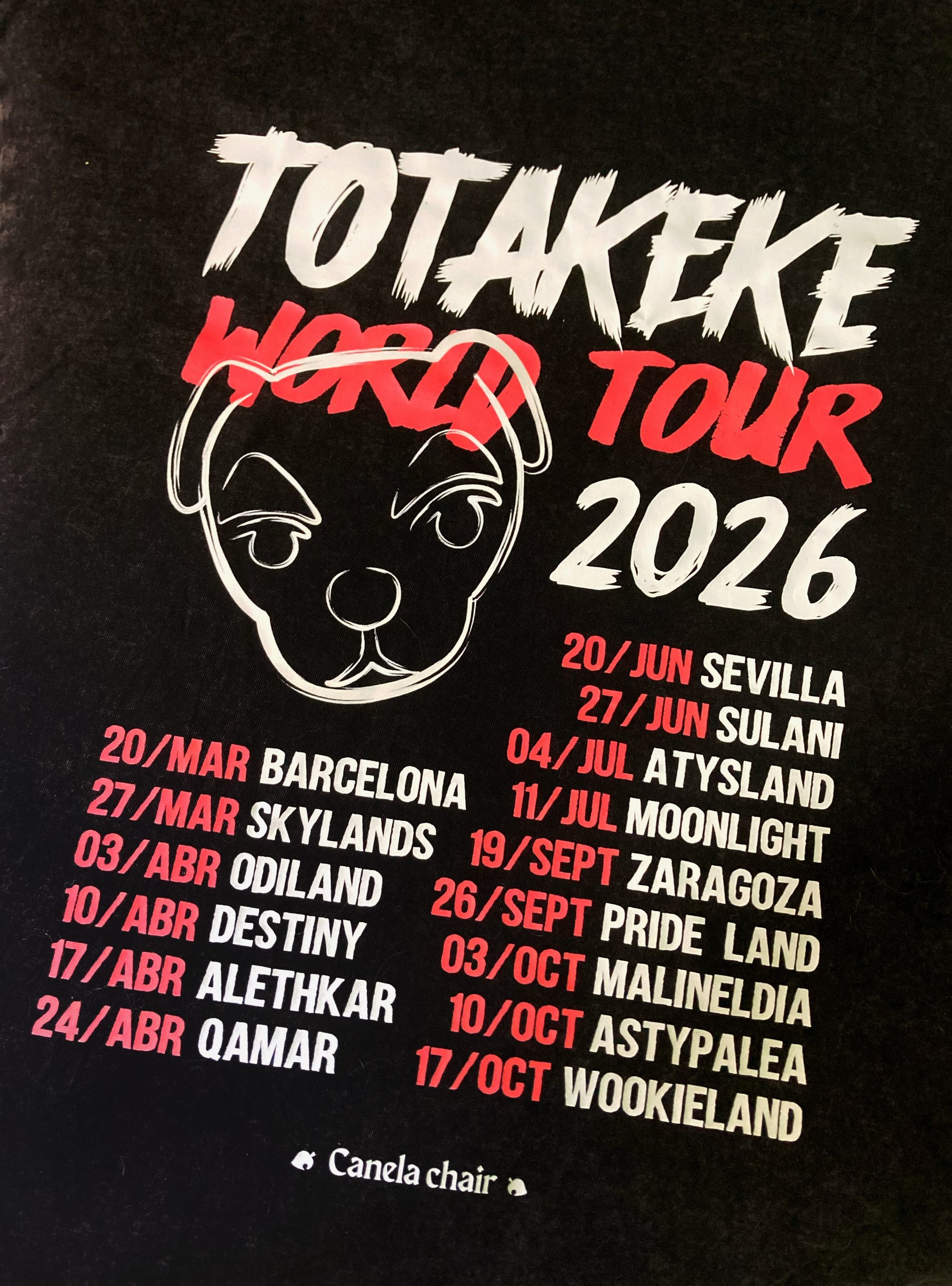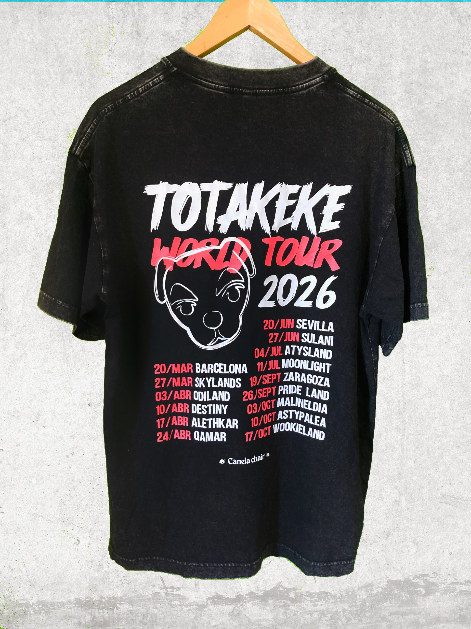 Si la sudadera es tu armadura para el frío, esta camiseta es tu pase oficial al backstage. Canelita ha diseñado la prenda definitiva para esos días de sol en la plaza, capturando la esencia pura de la gira de Totakeke.